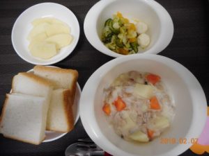 <幼児食> *食パン *ホワイトシチュー *フレンチサラダ *チーズ *りんご