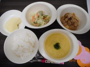 <幼児食> *ごはん *コーンスープ *ローストチキン *ポテトサラダ *りんご