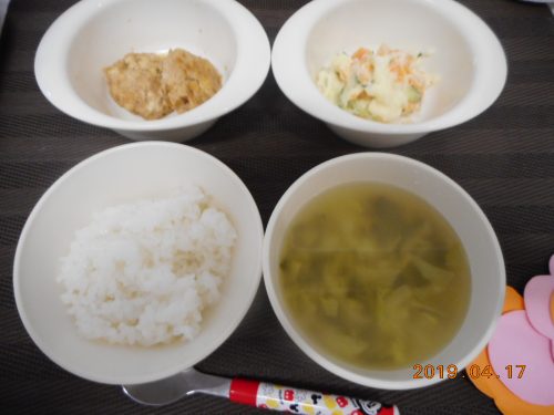 2019.04.17|給食ピックアップ 4月17日(水)お給食 <乳児食> *おかゆ *みそ汁 *豆腐のつくね焼き *茹で野菜 <幼児食> *ご飯 *みそ汁 *豆腐のつくね焼き *ポテトサラダ 前へ 次へ