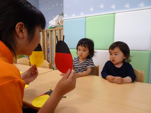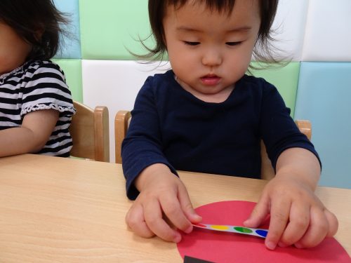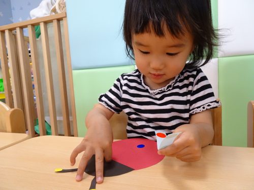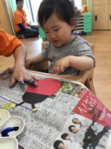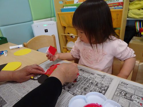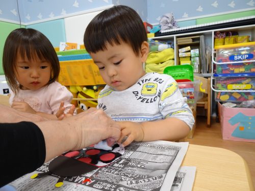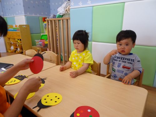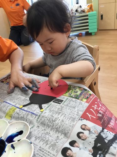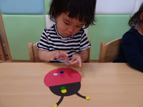 「テントウムシさんにシール貼りますよ~」と先生からお話しです。