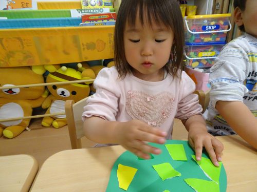 先生がちぎった折り紙を、貼り付けています!