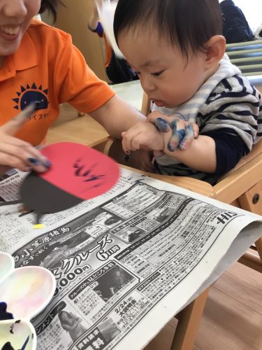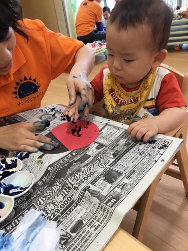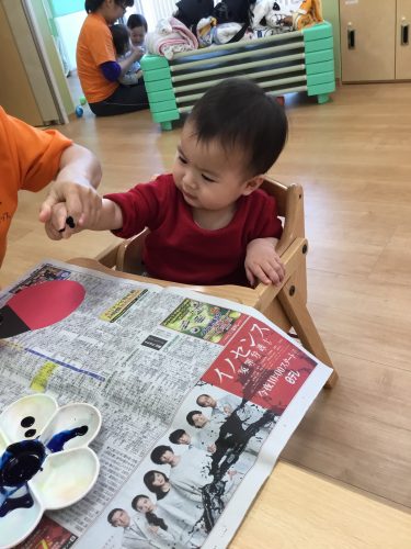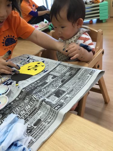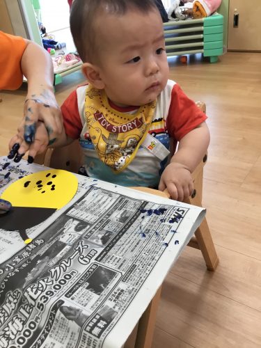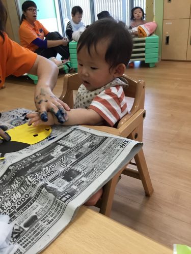 まずは、スポンジに絵の具を付けたものをペタペタッ✨