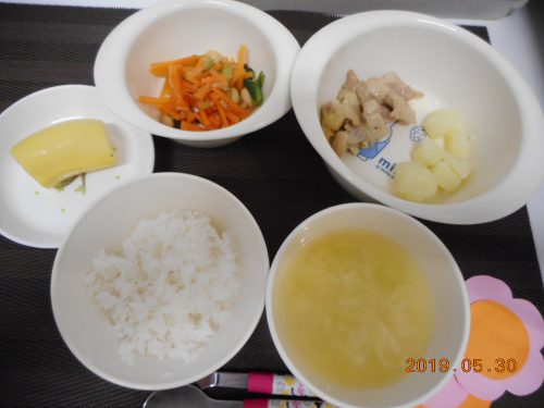 2019.05.30|給食ピックアップ 5月30日(木)お給食 <乳児食> *軟飯 *みそ汁 *照り焼きチキン *切干大根の煮物 *粉ふき芋 *バナナ <幼児食> *ごはん *みそ汁 *タンドリーチキン *切干大根の煮物 *粉ふき芋 *バナナ 前へ 次へ