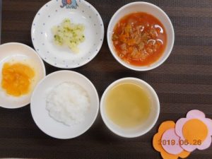 <離乳食> *軟飯 *みそ汁 *煮込みツナ *粉ふき芋 *オレンジ <幼児食> *ご飯...
