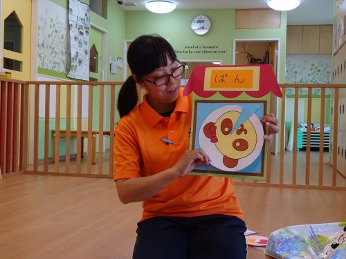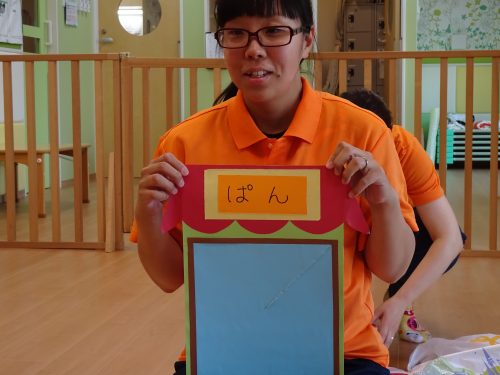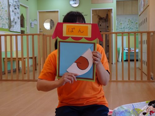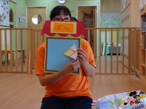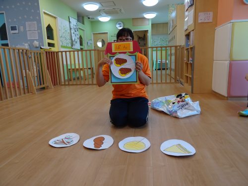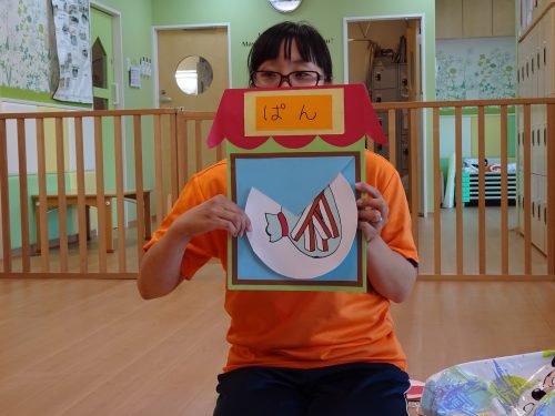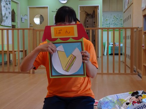 「パンやさんに おかいもの」という手遊びを、今回はくるくるシアターで見せてくれました