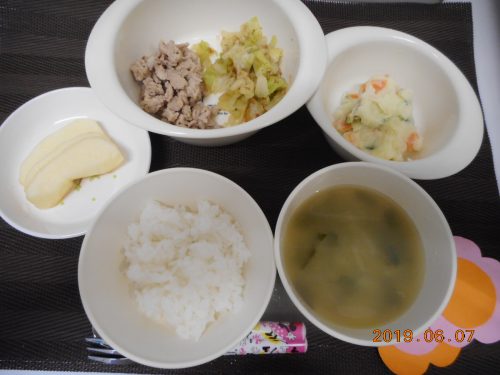 2019.06.07|給食ピックアップ 6月7日(金)お給食 <乳児食> *軟飯 *みそ汁 *そぼろ煮 *きゅうり *おかか和え *りんご <幼児食> *ご飯 *みそ汁 *焼肉 *ポテトサラダ *おかか和え *りんご 前へ 次へ