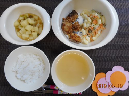 2019.06.19|給食ピックアップ 6月19日(水)お給食 <離乳食> *軟飯 *みそ汁 *煮魚 *茹で人参 *きゅうり <幼児食> *ご飯 *みそ汁 *魚の唐揚げ *マカロニサラダ *含め煮 前へ 次へ
