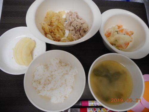 2019.06.21|給食ピックアップ 6月21日(金)お給食 <離乳食> *軟飯 *みそ汁 *そぼろ煮 *きゅうり *おかか和え *りんご <幼児食> *ご飯 *みそ汁 *焼肉 *ポテトサラダ *おかか和え *りんご 前へ 次へ