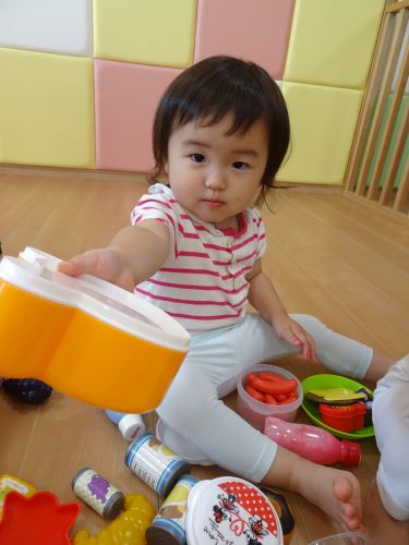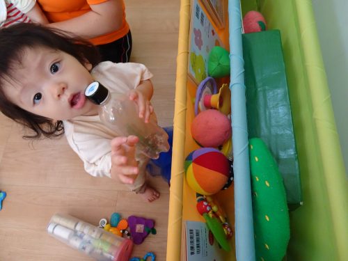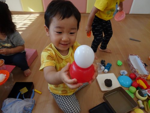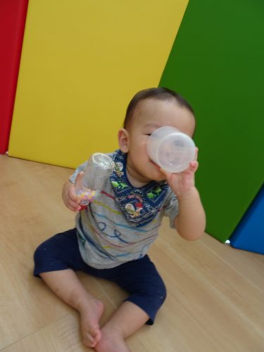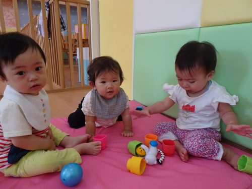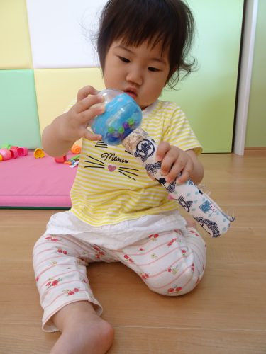 音が鳴るものを楽しんだり、口に入れて「これなんだ?」と確かめて遊んでいます。