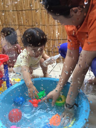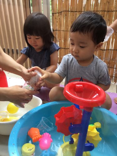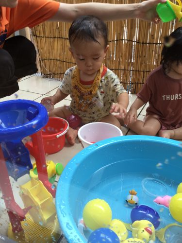 さすが一番年上のお姉さん・お兄さんで、すぐに水に触れたり、玩具を使ってお友だちや保育者と