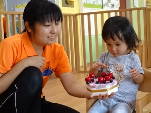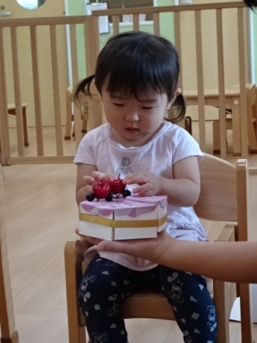 「ケーキ持ってきたよ~」と保育者が言うと、とっても嬉しそうな表情を見せてくれました。