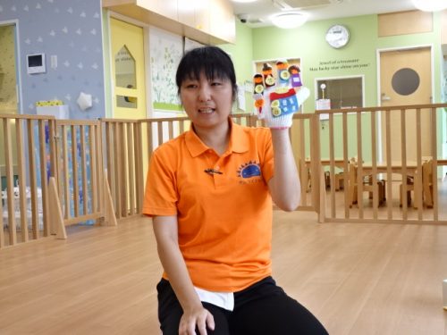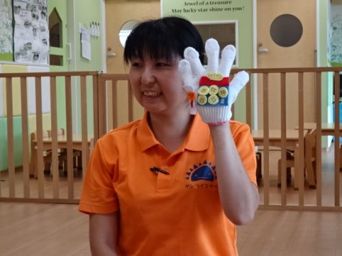手遊びである「パン屋に5つのメロンパン」の手袋シアターを見せてくれました(^^)