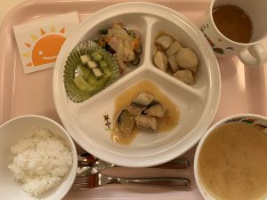 ご飯 味噌汁 さばの味噌煮 やさい炒め 里芋の煮物 キウイ