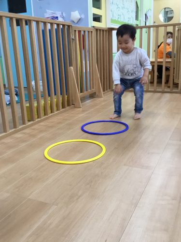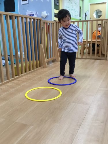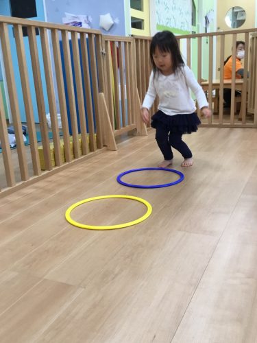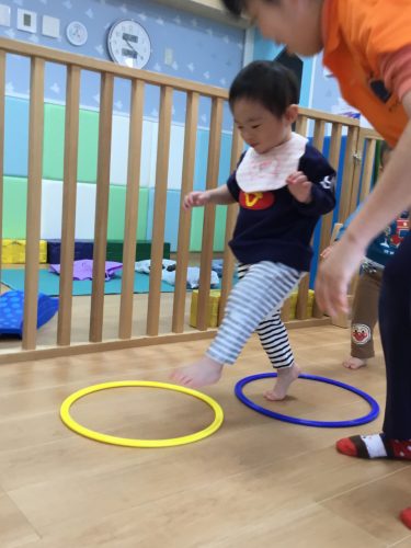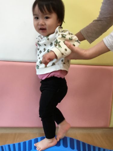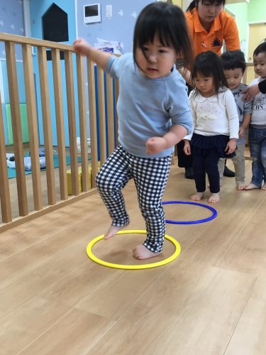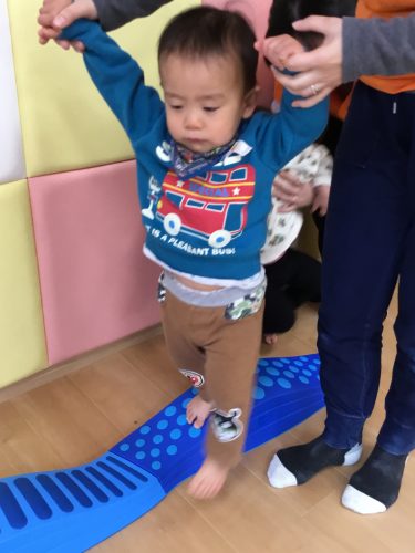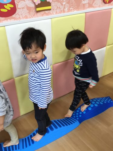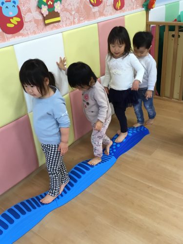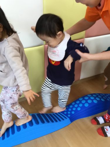 平均台では落ちないようにそ~っと歩いたり、壁や保育者の手をとって
