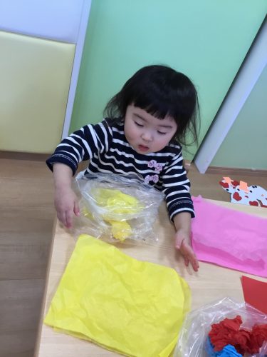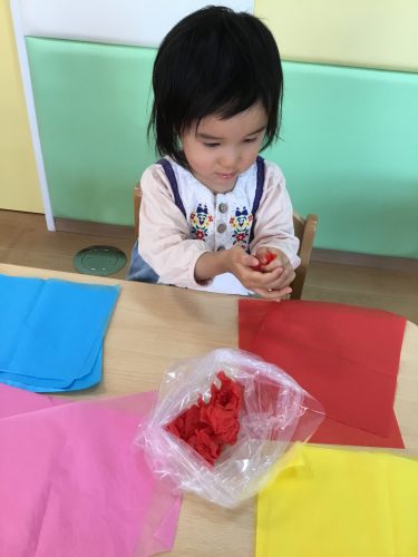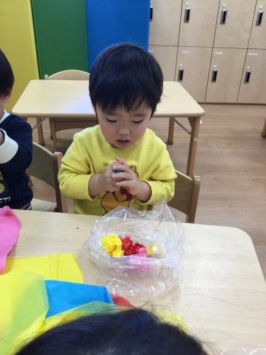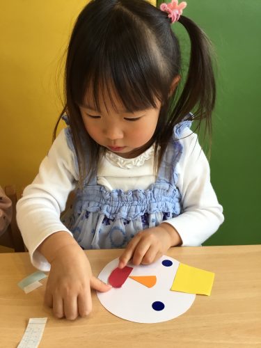 ゆきだるまに目を付けたり、カラフルな花紙を丸めてお洋服を作りました?