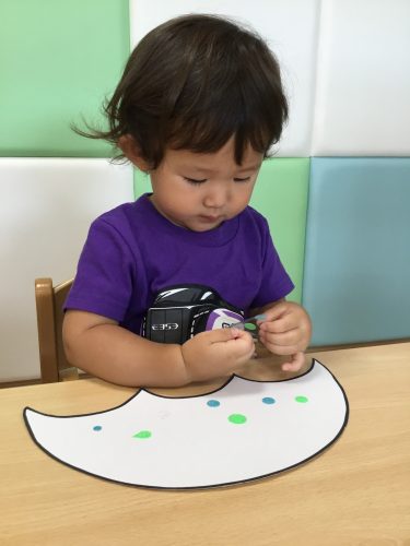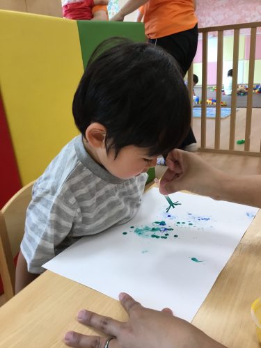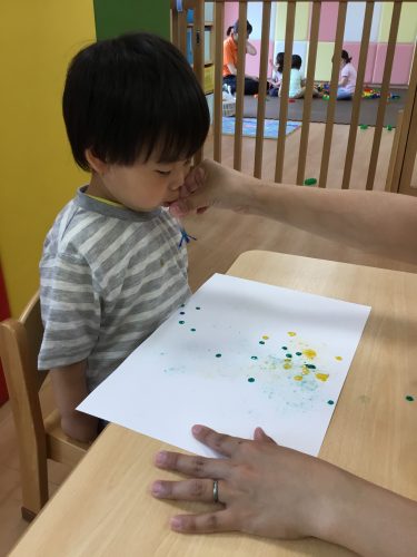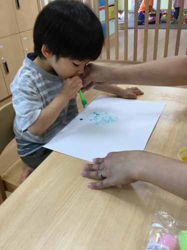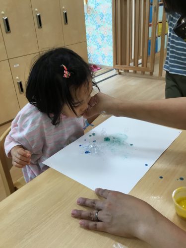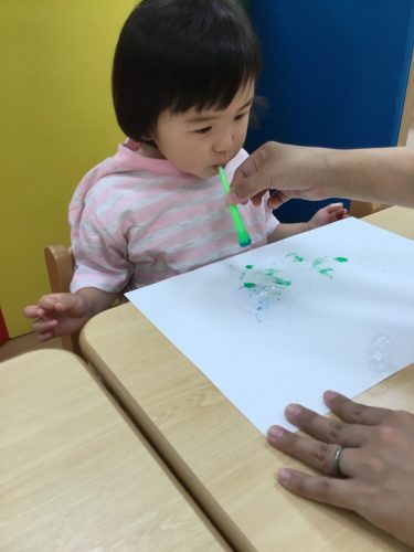 りんご組?さんは、絵の具を混ぜたシャボン玉を吹いて、しゃぼん玉アートをしました!