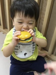 保育者に作ってもらったハンバーガーを大きなお口でパクリと食べる真似をして楽しんでいます![]()