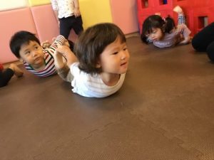 ピアノに合わせ、色々な生き物の動きをして楽しんでいます(カメになりきっています)