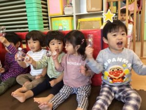 音楽大好きないちご組さんは、マラカスを片手にお歌をうたったり(おもちゃのチャチャチャ)