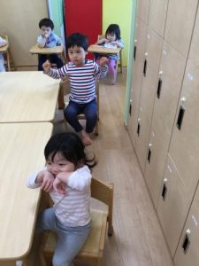 保育者が読むと一緒に掛け声をする子どもたち・・・