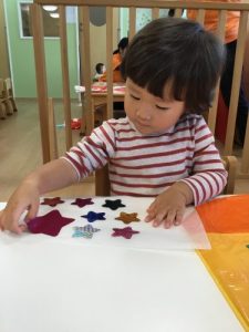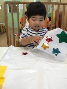 ?いちご組さんは、劇で使う衣装に、台紙から星のシールを剥がして貼りました