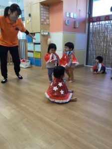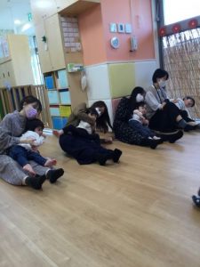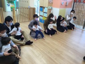 もも組さんは朝の会やリトミックで行っている「さくらんぼ体操」などをしました