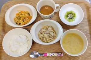 ご飯 味噌汁 鶏肉のすき焼き風煮物 スパゲティ野菜ソテー キウイ