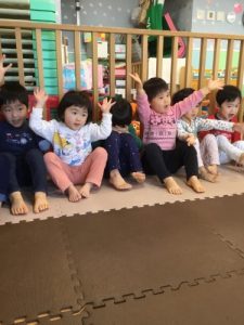 「ごんべさんのあかちゃん」や、「おもちゃのちゃちゃちゃ」にあわせて手を動かしたり