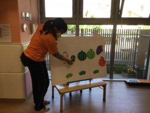 最後は保育者からのプレゼントとして、『ぴよちゃんのお散歩』というパネルシアターを見ました![]()