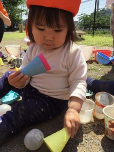 「カニさんにお砂を入れて…次は何を入れようかな✨」