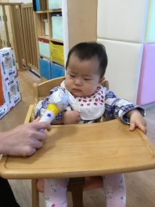 もも組のお友達はキラキラなマイクに驚きながらも、