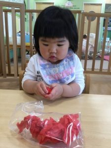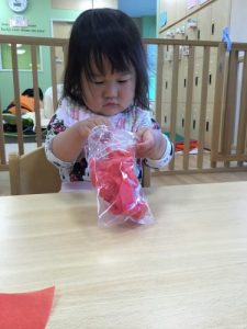 赤色のお花紙をくちゃくちゃした後、袋に入れていちごを作りました✨