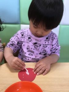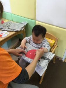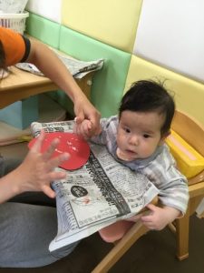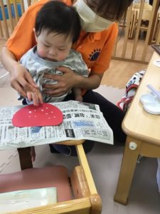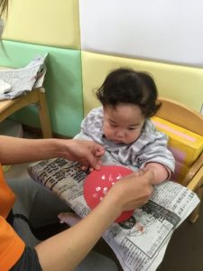 冷たい感触に不思議そうな表情をしながらも、保育者と一緒に上手に行っていました