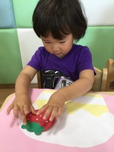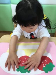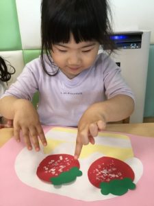 美味しそうないちごが完成した後は、大きなケーキの上にのりで貼りました?