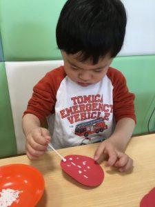 他にも、いちごを貼る台紙にカラフルなあおむしを貼りました?