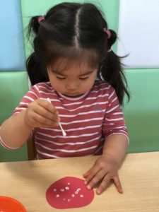 まずはいちごのつぶつぶを綿棒でスタンプ