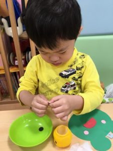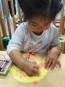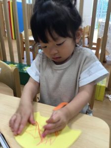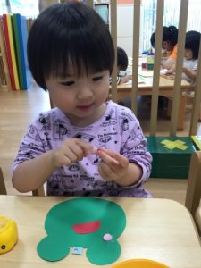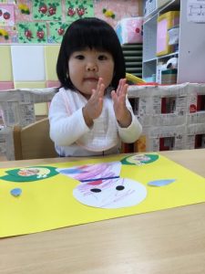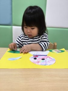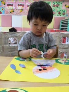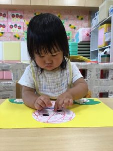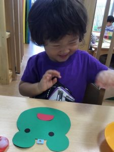 カエルや、てるてる坊主に目や口のパーツを貼った後、傘にクレヨンで模様をつけました![]()