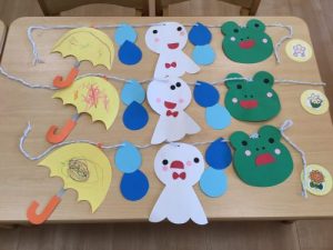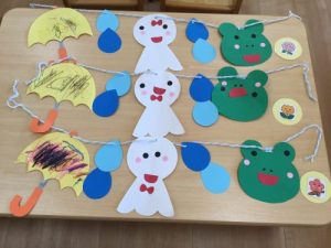 カエルに、傘に、てるてる坊主が繋がった、素敵なガーランドが完成しました✨