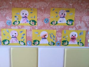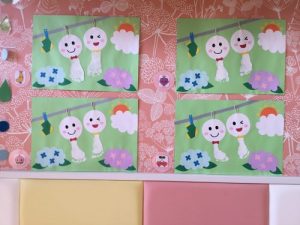 カラフルなてるてる坊主のまわりにある雨の雫も、貼り方に個性が出ていて素敵ですね![]()