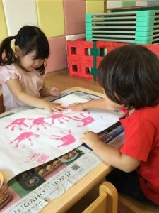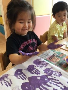 いちご組と、りんご組の英語のカリキュラムを興味津々で見ている子どもたち![]()