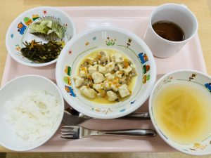 粥 味噌汁 麻婆豆腐 にんじんの甘煮 みかん缶