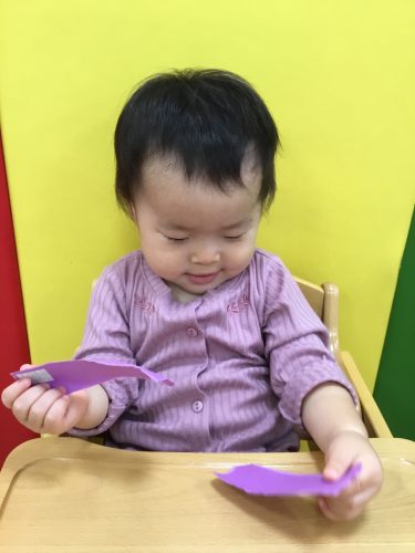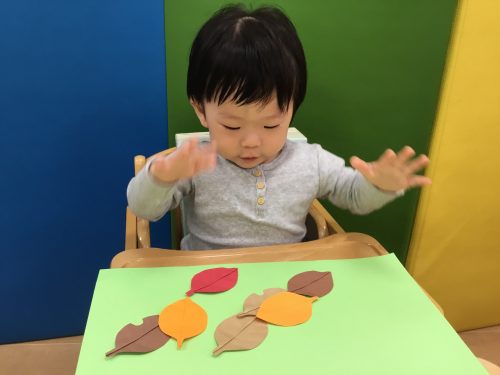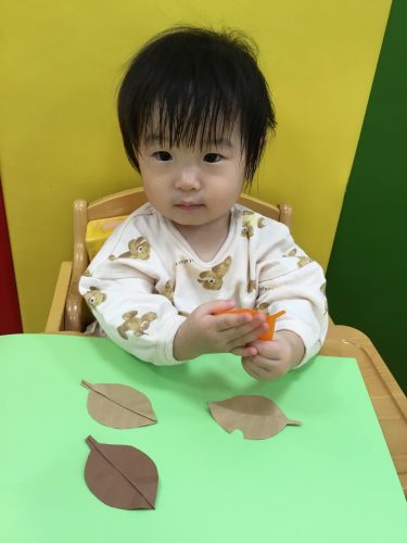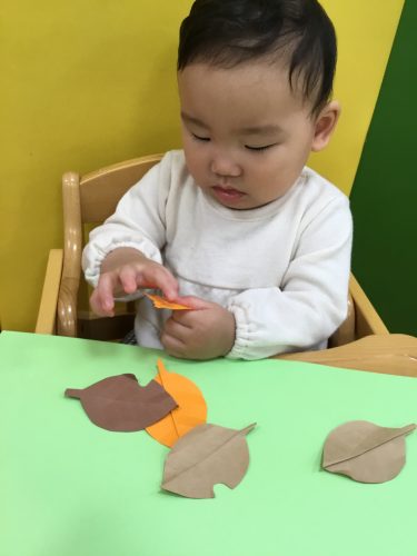 画用紙でできた落ち葉を貼ったり、さつまいもの皮を保育者と一緒にちぎったりして焼き芋を作りました?