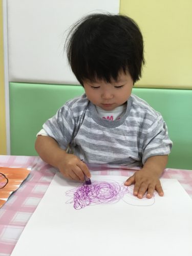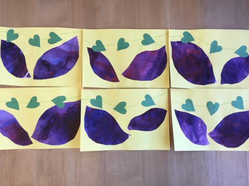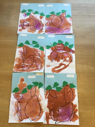 白い画用紙に紫のクレヨンでお芋を描いた後、茶色い絵の具ではじき絵をしました