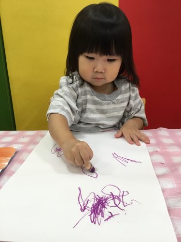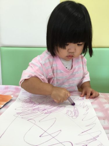 まずは赤と、青と、紫の絵の具で自由に描きました