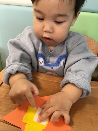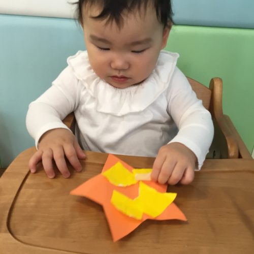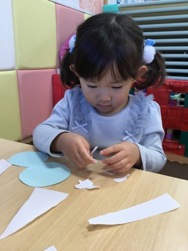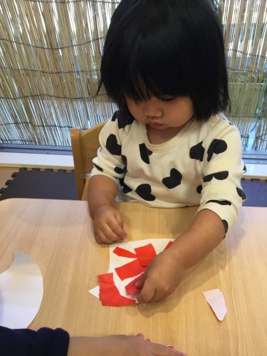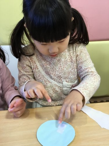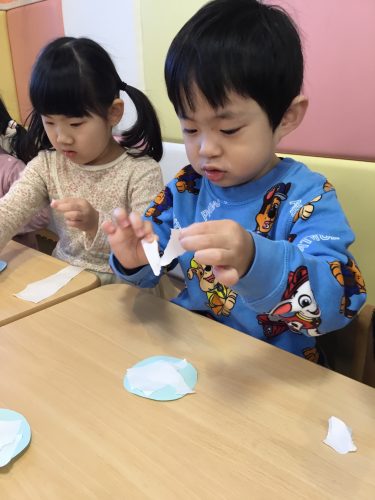 折り紙をちぎってのりで貼り、星やサンタの帽子、雪だるまを作りました!