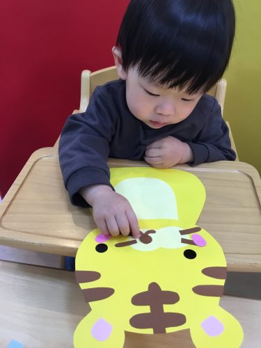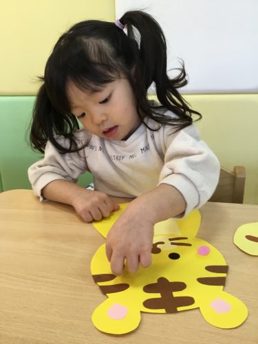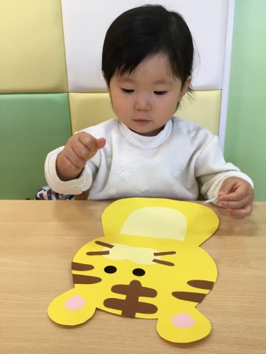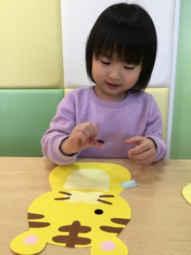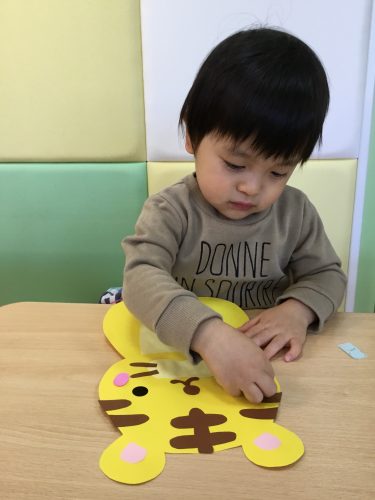 「ぼくのほっぺはここだから…どこに貼ろうかな」