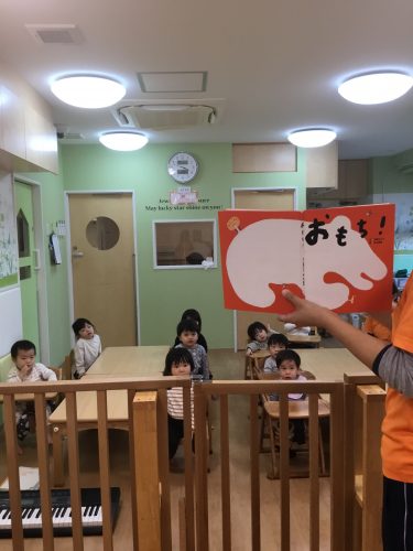 今週の絵本読み聞かせでは、お正月らしく「おもち!」の絵本を読みました![]()