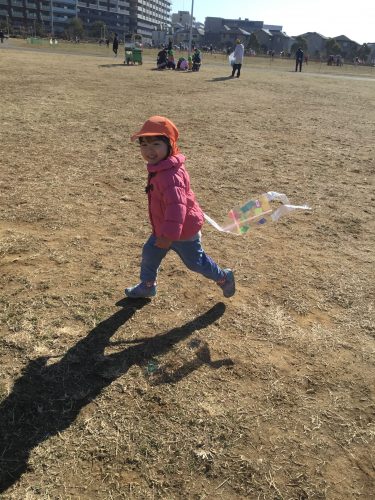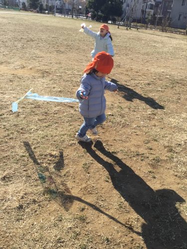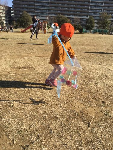 自分で作った凧を持って走り回り嬉しそうな子どもたちです?