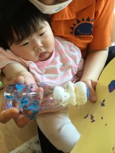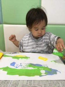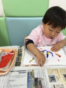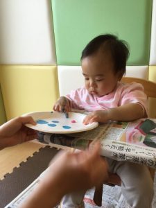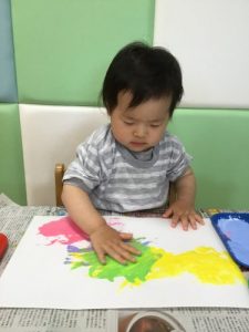 紙皿の上にのった絵の具を指で触ってみると…「なんだろう!!」と不思議そうにしていました⭐️