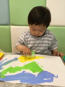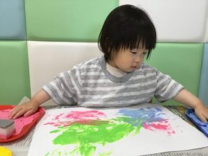真っ白い画用紙に、手やスポンジを使ってダイナミックに色をつけていきました![]()